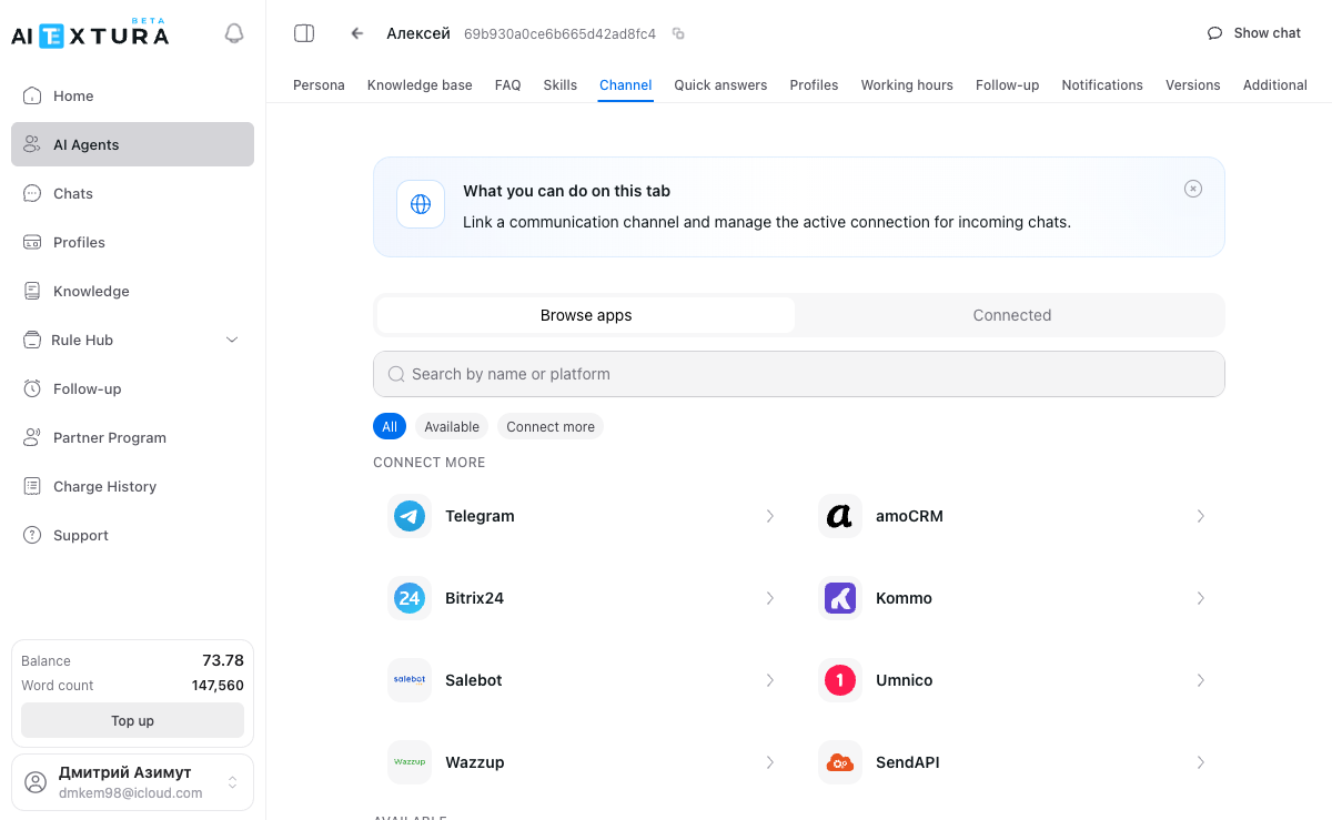 A channel is a messenger, CRM system, or other platform through which your AI employee communicates with real customers. A Telegram bot, amoCRM integration, or WhatsApp connection via Wazzup — these are all channels. Without a connected channel, the agent only works in the test chat inside AI Textura. This is convenient for setup and debugging, but to have the employee start responding to real customers, you need to connect at least one channel.Supported channels