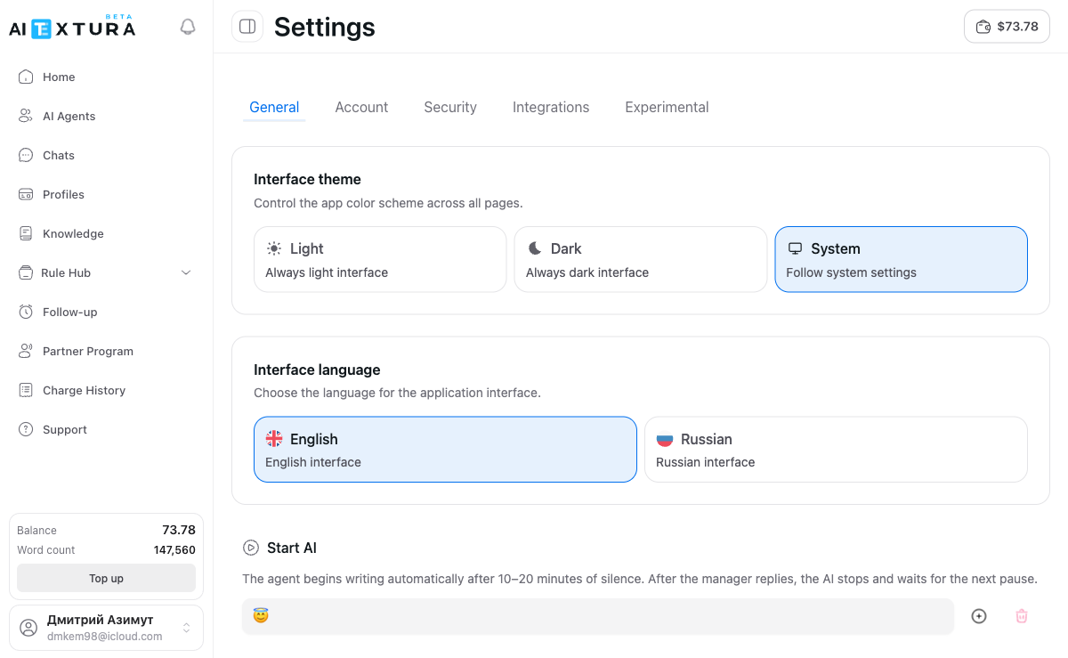 The first tab, open by default. It contains appearance settings and global commands for managing AI employees.Interface theme