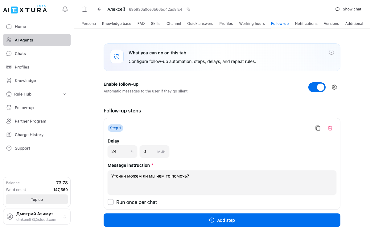 Go to the desired AI employee’s settings and select the Auto Follow-up tab.