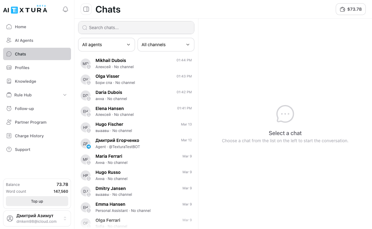 When you open a specific chat, in addition to the conversation history, additional information is available:- Client profile — filled fields: name, language, preferences, and any data the AI extracted from the conversation