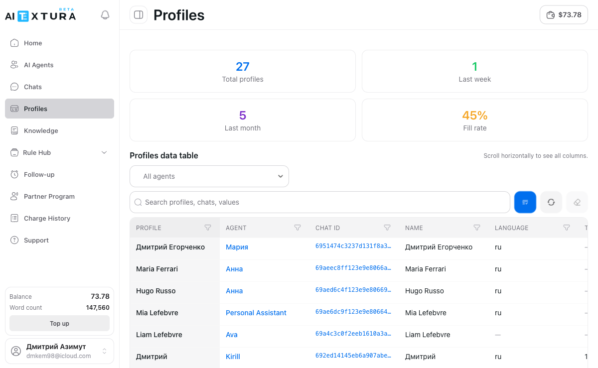 Each row represents one client. Standard columns include: profile, agent, Chat ID, name, summary, and language. Plus all custom fields you have configured. Table capabilities:- Filter by agent — view data for a specific employee or branch