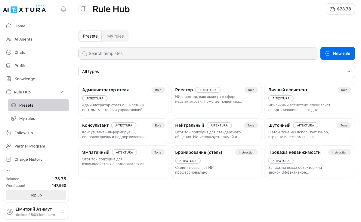 Rules in the “My Rules” section are grouped by type: Role, Tone, Script, custom. Use the “All types” filter and search by name to quickly find blocks, especially when you have many saved.
