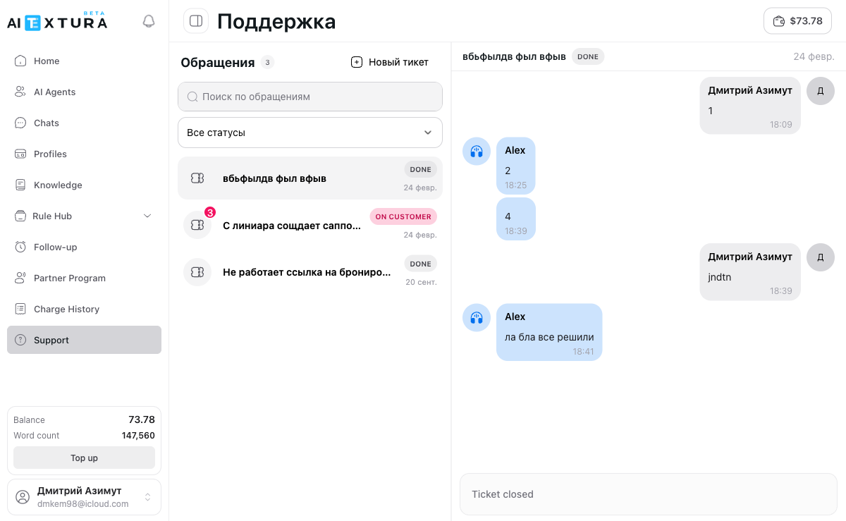 After creating a ticket, communication takes place in a chat format — directly in the right panel of the Support section. Your messages appear on the right, team responses on the left. To send a message:- Open the desired ticket by clicking on it in the list.