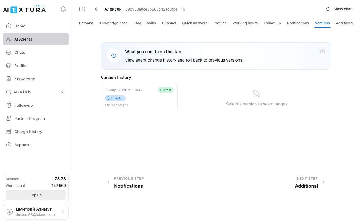 | Full snapshot | Every version includes all tabs: Persona, Knowledge, FAQ, Talents, Channels, Quick Answers, Profiles, Working Hours, Auto Follow-up, Notifications, Additional Settings |