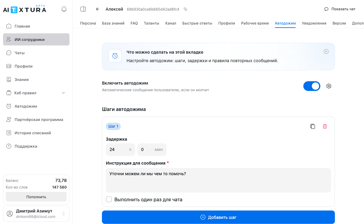 Откройте нужного ИИ-сотрудника и перейдите на вкладку Автодожим.