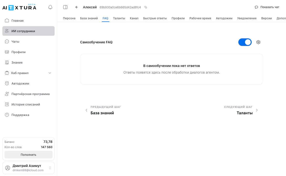 При включённом самообучении ИИ-сотрудник автоматически обрабатывает реальные разговоры с клиентами и извлекает из них пары “вопрос — ответ”.