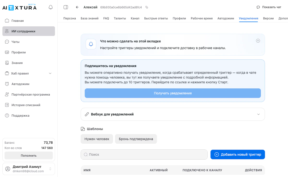 Перейдите в карточку нужного ИИ-сотрудника и выберите вкладку Уведомления.