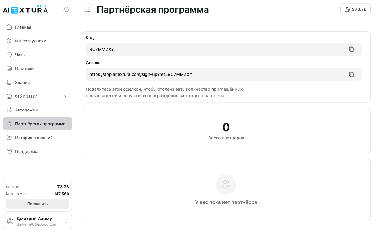 На странице Партнёрская программа отображается блок Всего партнёров — он показывает, сколько пользователей зарегистрировалось по вашей ссылке или коду. Счётчик обновляется автоматически и учитывает только завершённые регистрации.Если пользователь перешёл по ссылке, но не создал аккаунт, он не засчитывается.