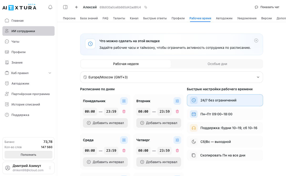 Расписание действует для всех каналов, подключённых к сотруднику. Если нужен разный график для разных каналов — создайте отдельных ИИ-сотрудников.